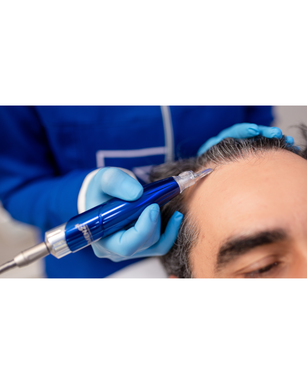 Intradermoterapia para aplicação direta de vitaminas, antioxidantes e nutrientes no couro cabeludo.