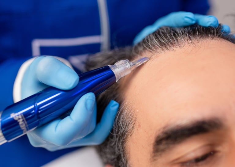 Intradermoterapia para aplicação direta de vitaminas, antioxidantes e nutrientes no couro cabeludo.